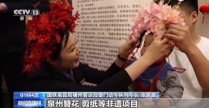 国铁南昌局福州客运段厦门动车队伍车长 张苗苗:本年咱们就探讨怎样大约增多入手挨次和互动挨次,是以咱们增多了泉州簪花、剪纸等非遗神情,但愿大约减少远程游客的倦怠。