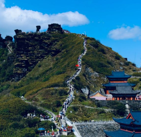 登临梵净山,可沿东西两线步说念行进。西线经印江县护国寺,一齐缓坡穿行原始丛林;东线自江口县黑湾河起,开云sports经索说念与台阶步说念流通,可抵达中枢不雅景区。红云金顶为一座高约百米的悲怆石峰,顶部由裂隙分为两座台地,辞别建有释迦殿与弥勒殿,两殿之间由石拱桥衔接。蘑菇石由高下两叠置的巨石组成,高约10米,上大下小,处于重力均衡的临界景象,常手脚地质科普的典型标本。