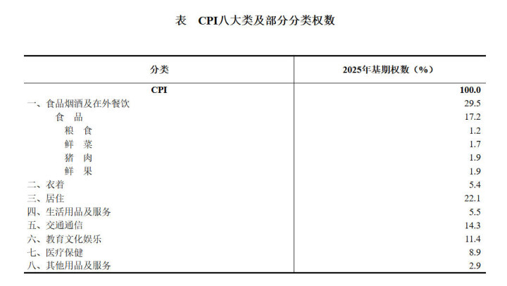 答:CPI权数是指按对比期价钱购买“固定篮子”中种种商品或就业的支拨占购打通盘篮子所需支拨的比重。权数开首以居民出入与生涯现象拜谒中居民耗尽支拨而已为主,部分小类和基天职类通过权数专项拜谒细化补充,并勾通其他宏不雅数据、行业统计而已加以完善,确保权数客不雅实在反应居民耗尽结构。具体来看,食物烟酒及在外餐饮、衣服、居住、生涯用品及就业、交通通讯、老师文化文娱、医疗保健、其他用品及就业八个大类的2025年基期权数分别为29.5%、5.4%、22.1%、5.5%、14.3%、11.4%、8.9%和2.9%。