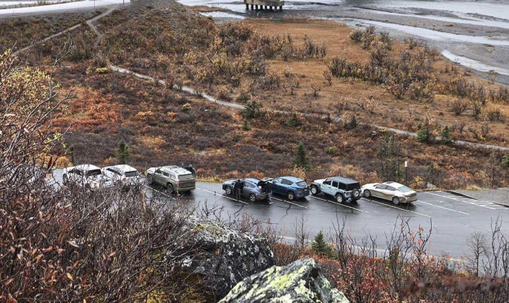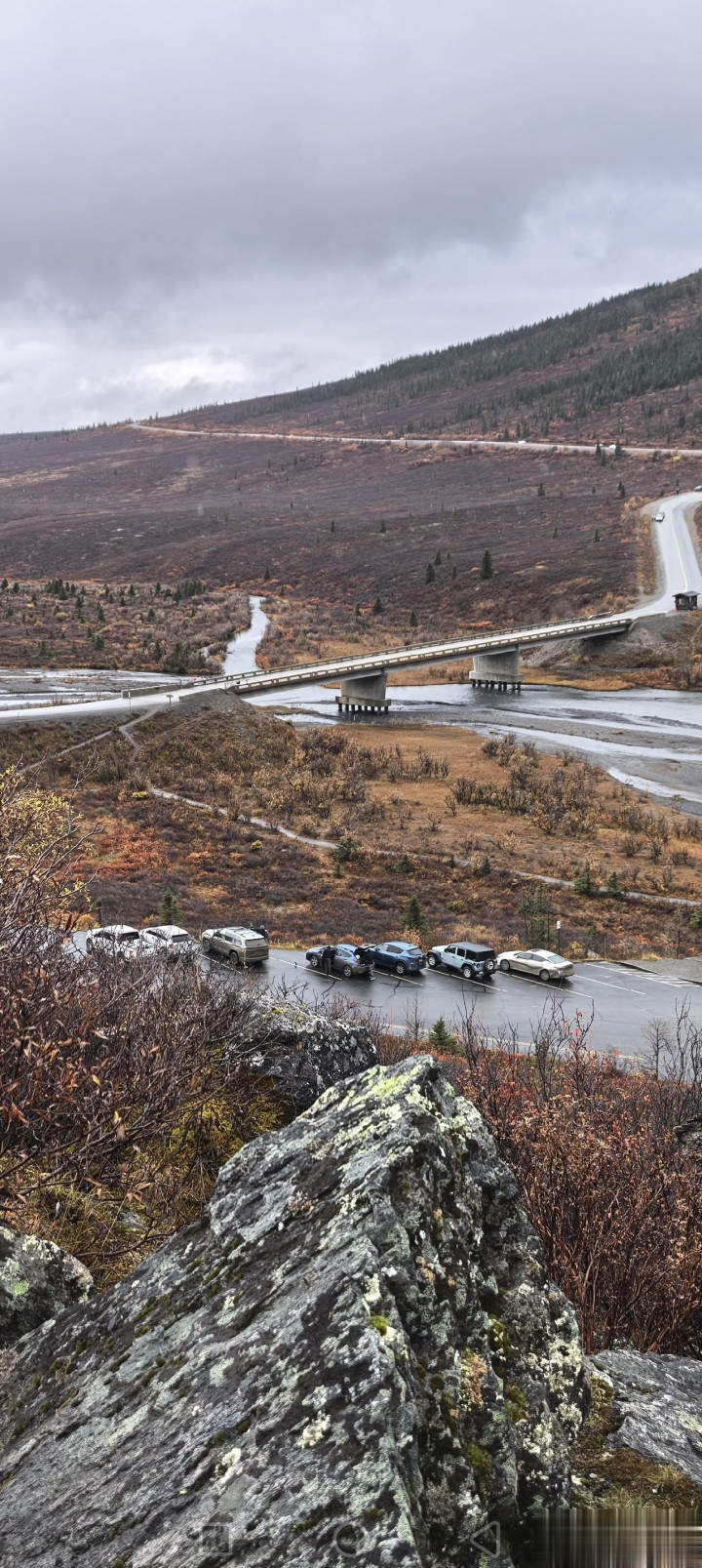 经过高深的一齐登攀后,终于站在了这座不算太高的山峰之上。沿着山峰的行走也曾起挪动伏,但要比单纯的登攀要省许多力气,更让东说念主欣忭的是,随时不错遥看山两侧的不同局势。德纳利国度公园唯独的德纳利公园路像一条障碍的绸布带平铺在地上,小汽车像一个个小虫子在上面逐步爬行。
