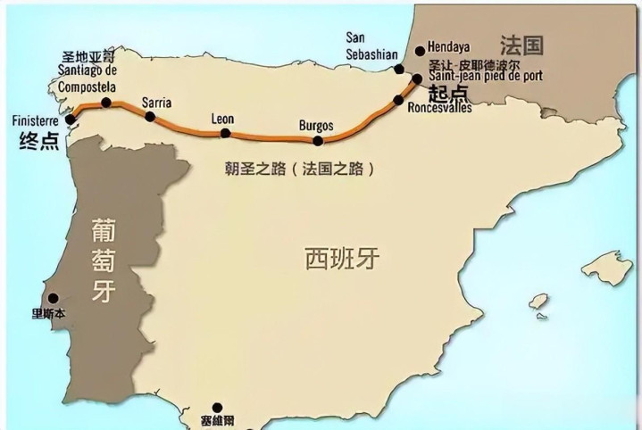 西班牙朝圣之路:有南边之路(1000公里)、朔方之路(800公里)绝顶是圣地亚哥港。