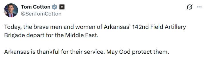 阿肯色州共和党籍联邦斟酌员汤姆·科顿在X平台发文说明了这一讯息,“阿肯色州感谢他们的付出。愿天主保佑他们。”