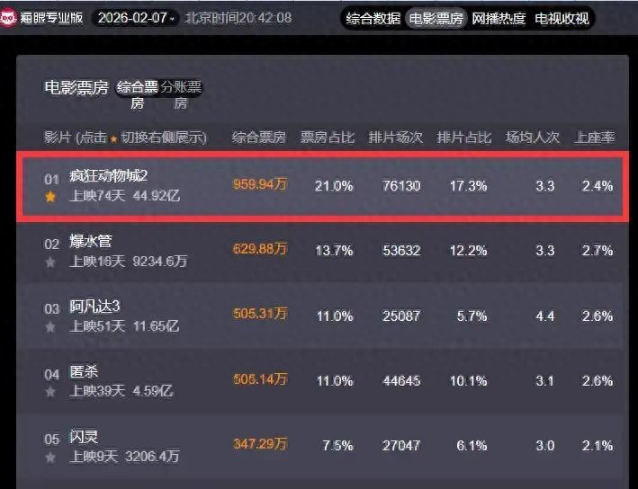 ,靠什么冲?靠排片。最近几天的宇宙排片里,《恣意动物城2》尽然还能拿到十几的比例。有一又友吐槽说,《阿凡达3》上映一个月后排片齐掉到个位数了,你一个动画片还能吃这样久的红利,是不是有点夸张?