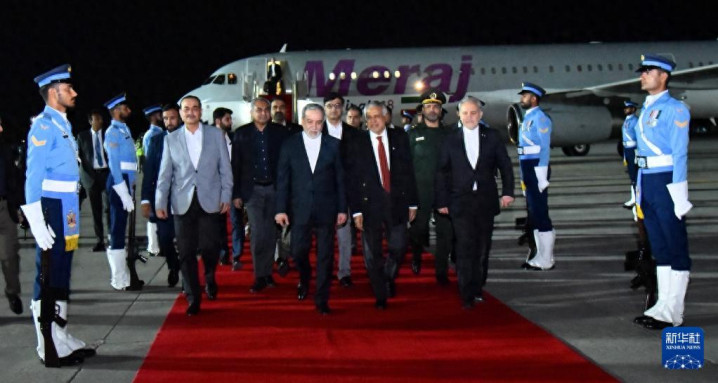 4月24日晚,伊朗外长阿拉格都(中)指导的代表团抵达巴基斯坦都门伊斯兰堡。巴副总理兼外长达尔、陆军照顾长穆尼尔等高档官员到场管待。新华社发