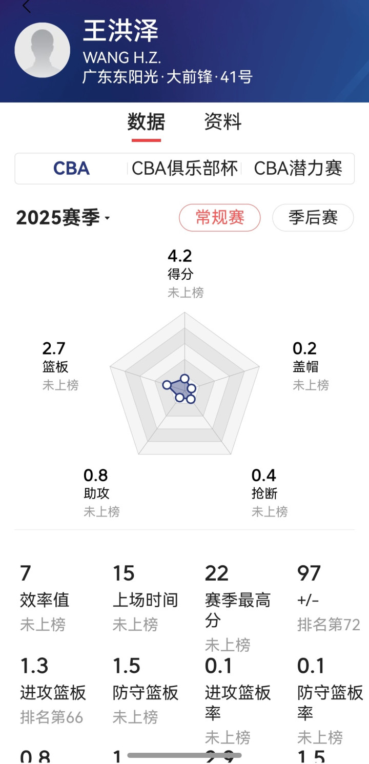王浩然2023~2024年第一个赛季才场均上场12.8分钟得3.6分1.8板0.5助0.3断;王洪泽到现在CBA一年龄生场均时间15分钟得4.2分2.7板0.8助0.4断。第一赛季的得益好过王浩然,只好刻苦教练,天禀异禀的王洪泽定会有光辉得益!