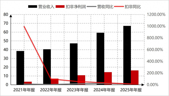 2025年,东阿阿胶交出了格外可以的事迹报表,营业收入67亿元,同比增长13.17%,扣非净利润16.38亿元,同比增长13.62%。营业收入和扣非净利润集结五年正增长,集结三年双位数增长,事迹发扬号称超预期,毕竟中药行业2025年营业收入和利润均是负增长的态势。