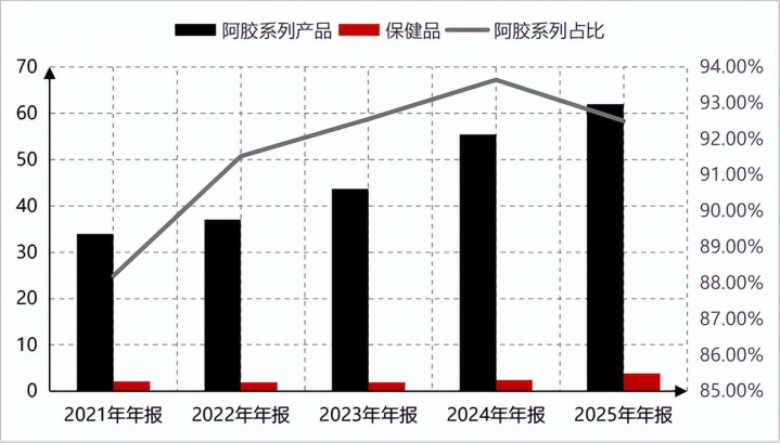 东阿阿胶基本运筹帷幄策略是中成药+保健品双轮运转。2025年以阿胶系列为中枢的中成药板块营业收入为61.98亿元,占营业收入的比重为92.50%,是东阿阿胶营业收入的主要泉源。纵不雅最近五年中成药板块占营业收入的比重在90%以上,是东阿阿胶最中枢,最大的事迹泉源。