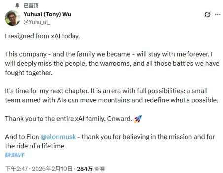 2月10日,xAI纠合独创东谈主吴宇怀发文称,他本日从xAI辞职了。吴宇怀说,他将恒久铭记这家公司,以及他们共同缔造的全球庭,他将开启东谈主生新篇章。吴宇怀说,这是一个充满无穷可能的期间:一支装备东谈主工智能的小团队足以填海移山,重新界说可能性的边界。他同期也感谢马斯克对“服务的信任”。