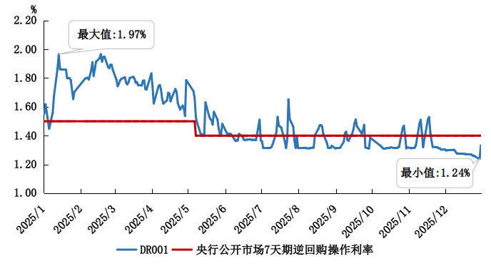 2025年,银行业进款类金融机构间利率债隔夜质押式回购(DR001)年加权平均利率为1.46%,较2024年下跌19个基点;DR007年加权平均利率为1.63%,较2024年下跌19个基点;银行间市集隔夜质押式回购(R001)年加权平均利率为1.55%,较2024年下跌21个基点。2025年,DR001与央行公开市集7天期逆回购操作利率的利差日均值为7个基点,R001与DR001的利差日均值为8个基点。