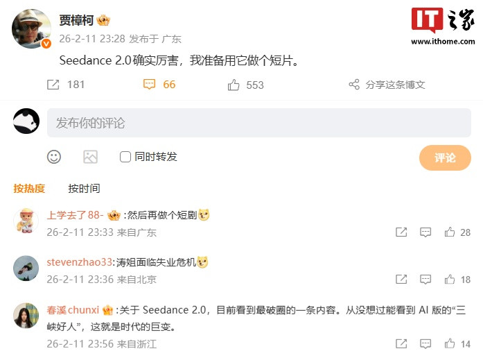 IT之家2月12日讯息,电影导演贾樟柯昨晚公开拓文传颂字节超越Seedance2.0“确乎历害”,他示意我方准备用它作念个短片。