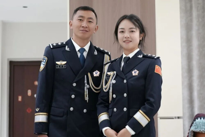民警张李国与妻子李咸婷。新华社发