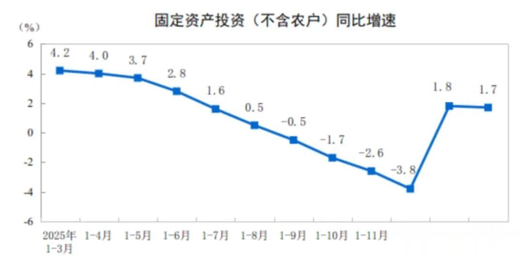 投资方面,一季度,宇宙固定金钱投资(不含农户)102708亿元,同比增长1.7%,上年全年下跌3.8%。